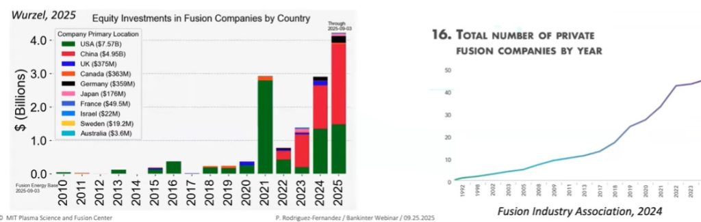 En los últimos cinco a seis años, la inversión en startups de fusión se ha disparado. Actualmente, hay más de 8.000 millones de dólares invertidos en el sector privado a nivel global, con más de 40 dispositivos diferentes en desarrollo. Al menos siete empresas superan los 200 millones de dólares en capital riesgo. Solo en 2025, se estima que la inversión combinada entre China y Estados Unidos superará los 4.000 millones de dólares.