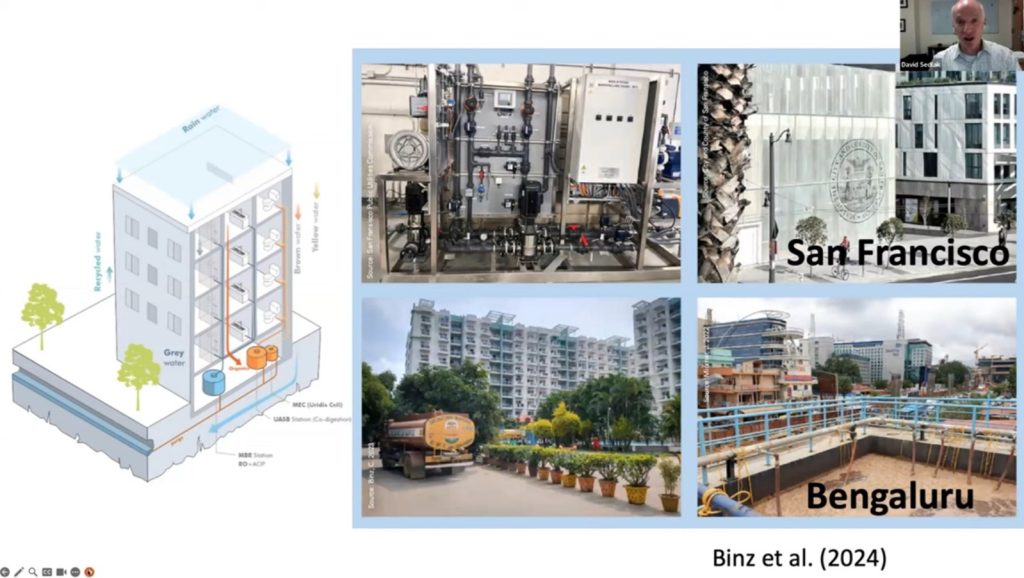Sedlak explica que los avances en filtración y purificación han hecho posible que incluso el agua reciclada dentro de un edificio pueda ser utilizada para consumo humano. En India, estos sistemas están permitiendo la autosuficiencia hídrica de algunas comunidades, reduciendo su dependencia de fuentes externas. Según Sedlak, estos sistemas pueden amortizarse en menos de 10 años gracias al ahorro en la factura del agua.