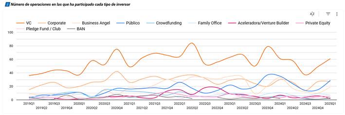 En cuanto al tipo de inversor que participa en las rondas, en el primer trimestre de 2025, los fondos de Venture Capital continúan liderando. En segundo lugar, se sitúan las inversiones de entidades públicas, seguidas en tercer puesto por las realizadas por corporaciones.