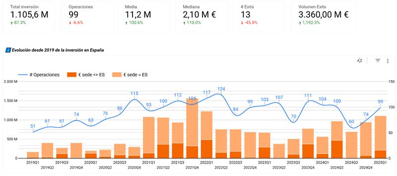 En el primer trimestre de 2025 se ha registrado una inversión total superior a 1.100 millones de euros. El volumen total de inversión es un 87% superior al del primer trimestre del año anterior; produciéndose un incremento del 17% respecto al último trimestre del año 2024, y confirmando la tendencia alcista con tres trimestres consecutivos de crecimiento. Sin embargo, el número de operaciones disminuyo un 7%, con 99 operaciones, en comparación con el primer trimestre de 2024.