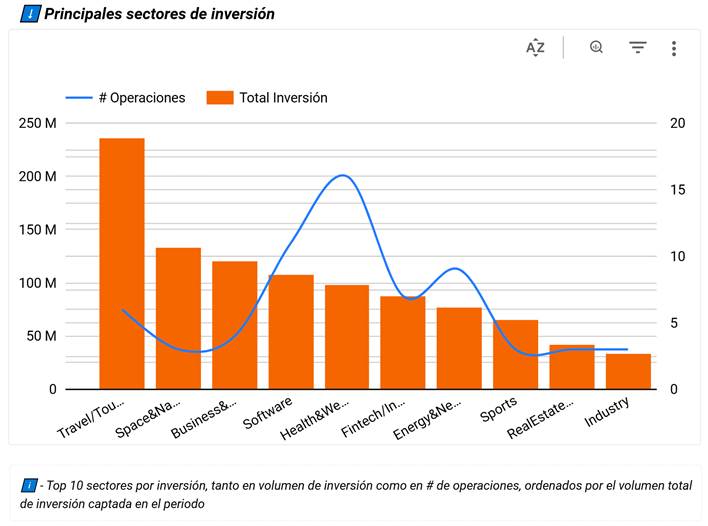 - Sectores más activos: Los sectores de Travel & Tourism y Space & Navegation destacaron en capital invertido, mientras que Health & Wellbeing y Software fueron los más activos en número de operaciones.