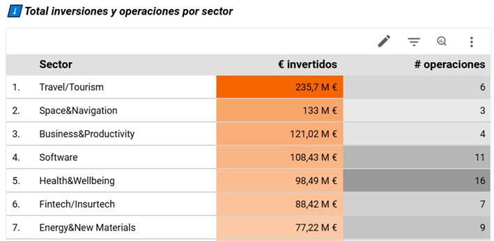 Si se considera el capital invertido, destacan Travel & Tourism (235 millones de euros) y Space & Navegation (133 millones de euros). Sin embargo, en términos de cantidad de operaciones, los sectores más activos fueron Health & Wellbeing y Software, con 16 y 11 rondas, respectivamente.