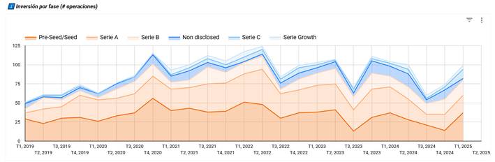 - Interés en fases maduras: Se ha observado un aumento en las inversiones en fases más avanzadas, sin embargo, las fases iniciales como Seed y Series A han visto descensos en el número de operaciones.